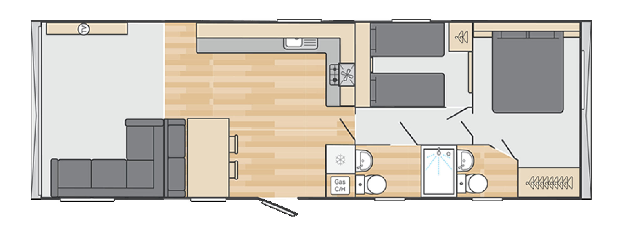 36 x 12. 2 bedrooms, central heating, double glazing, intergrated dishwasher and fridge-freezer, in cream and anthracite colours with front slidiong doors onto an enclosed decking.